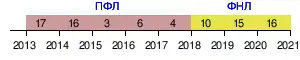 | 2017/18 | ▲ 4 из 17 | 32 | 16 | 9 | 6 | 58 - 37 | 54 | переход в ФНЛ | |