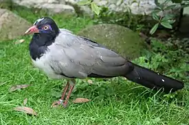 Длина тела составляет около 65—70 см. Оперение преимущественно светло-серое, голова, шея и длинный хвост тёмные. Неоперённые участки на лице синего окраса, окологлазное кольцо лилового цвета, радужины жёлтые. Сильный клюв кораллового цвета.