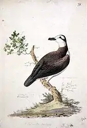 Краснокрылый куриный голубь также известен как куриный голубь Туамоту, голубь с белым воротником, голубогрудый куриный голубь, куриный голубь Общества, куриный голубь Островов Общества и куриный голубь островов Туамоту.[4]