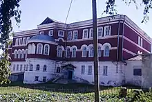 Этот дом ( здание с колоннами или дом с тремя балконами , стоящее во дворе школы №1) принадлежал известному в Краснослободске и уезде купцу Абраму Дмитриевичу Муромцеву. Его называли «монополистом-магнатом, захватившим в свои руки всю хлебную закупку в Краснослободском уезде». Такое положение нельзя было завоевать быстро, тем более что в городе жили и другие магнаты – Иван Михайлович Севостьянов, Лука Иванович Ненюков и др. Муромцев довольно широко занимается благотворительной деятельностью: жертвует на богадельню и сирот (богадельня Муромцева (Владимирская обитель), был одним из инициаторов организации женского Успенского монастыря. О нём известно, что построил каменный храм в с. Гумны, Успенскую церковь в Краснослободске и, даже ослепнув, продолжал раздавать деньги на паперти церкви бедным. Усадьба была построена предположительно в конце XVIII – начале XIX века, т.е. в эпоху классицизма в русском зодчестве. В бывшем доме купца элементы классицизма проявляются особенно. Эта постройка характеризуется уравновешенностью, чётким и спокойным ритмом, выверенностью пропорций. Парадный вход расположен в центре и оформлен в виде портика – выступающей вперёд части здания с колоннами и фронтоном. Архитектура здания указывает на то, что оно было построено гораздо раньше трехэтажного корпуса (1893). Поскольку основная деятельность купца приходилась на начало XIX века в Краснослободске (об этом пишет в своей работе краевед А.С. Никольский), остается предполагать, что дом с колоннами уже стоял в вышеуказанное время, когда хозяин имел для его строительства все необходимые средства. При определении даже приблизительной датировки очень важно установить и возраст хозяина. В известной работе «Краснослободский женский монастырь» Иван Беляев (священник-краевед второй половины XIX века) дважды употреблял слово «старик», говоря о Муромцеве. Лексическое определение этого слова позволяет сделать вывод о его возрастном значении. Следовательно, к 1810 году (дата основания Успенской обители) Абраму Дмитриевичу было за шестьдесят лет. К этому времени он был очень богат: ему принадлежали купоросные заводы, расположенные между городом и будущим селом Старые Горяши. Заводы располагались на том месте, которое сейчас в простонародье называется «черная земля». После его смерти (ум. в 1821 г.) зданием владел магнат Севастьянов, который продал его Пензенской епархии.
