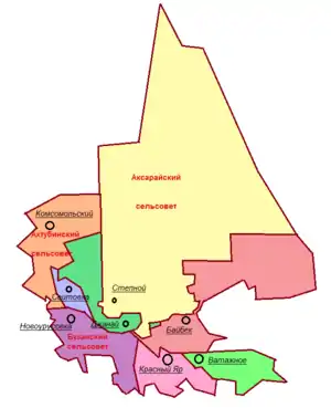 | 1 | Аксарайский сельсовет | посёлок Степной | 4 | ↘750[2] | 2920,98[1] |