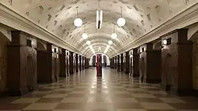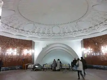 Иван Фомин построил станцию в классическом стиле. Свод центрального зала станции поддерживают мощные пилоны с относительно неширокими проходами к боковым залам. Цвета облицовочных материалов соответствуют названию станции[23]. Основные поверхности пилонов облицованы мраморизованным известняком красно-бурого и мясисто-красного цветов в приглушённых разводах из грузинского месторождения Старая Шроша[10]. Чтобы зрительно облегчить массивные пилоны, они были поделены на три части с центральной нишей и двумя выступами по бокам. В центре каждого такого выступа были выделены соразмерные человеку декоративные ниши, завершённые полусферами. Эти ниши отделаны светлым, сероватым, крупнозернистым уральским мрамором месторождения Коелга. Средние части пилонов отделаны жёлтым мраморовидным известняком месторождения Биюк-Янкой. Базы пилонов покрыты чёрным с ультрамариновыми вкраплениями украинским лабрадоритом[24]. Тяжесть свода зрительно принимает на себя ступенчатый карниз. Свод декорирован шестиугольными и квадратными кессонами. В декоре станции повторяется мотив ворот — декоративные ниши в пилонах, сводчатые проходы между пилонами, проходы к эскалаторам, свод центрального зала. Центральный зал освещают свисающие с потолка два ряда шарообразных светильников[11]. Путевые стены облицованы керамической плиткой. Пол центрального зала выложен в шахматном порядке из плит красного и серого гранита (ранее покрытие было выложено керамической плиткой — квадратной метлахской плиткой красного цвета и шестиугольной кремовой)[24][25].