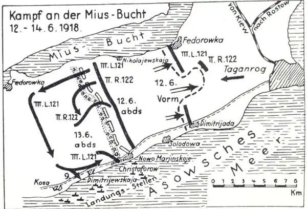 Свыше 6 тысяч красных бойцов (по другим данным до 20 тысяч[1]) на судах Азовской флотилии переправились через Таганрогский залив и, захватив значительный плацдарм, 10 июня заняли северный берег Миусского полуострова и развернули наступление на Таганрог. В самый разгар боев И. Л. Сорокин оставил Батайск. Отступив от Батайска, он предоставил тем самым немцам возможность сосредоточить свои силы против отрядов Красного десанта и перейти в наступление[8]. Подразделениям 7-й Баварской кавалерийской бригады была поставлена задачи провести разведку в районе Федоровки и северной и западной частей Миусской бухты. Германской кавалерии была поставлена оперативная задача — установить контроль над маяками в районе Лакедемоновки и на северо-западном берегу полуострова для того, чтобы воспрепятствовать высадке десанта на северном берегу[1].