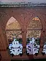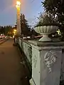 При входе на мост на тумбах расположены вазоны.