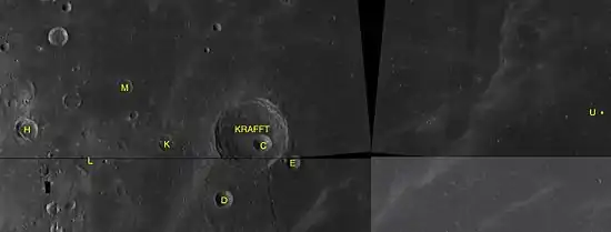 - Сателлитные кратеры Крафт H и Крафт K имеют двойные участки вала.