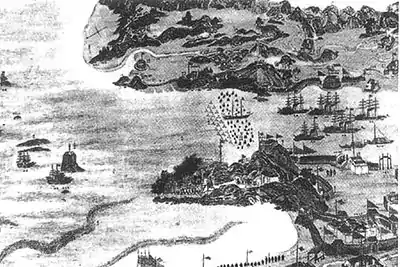 «Наньчэнь», «Наньжуй» и «Кайцзи» прибыли к Чжэньхай – крепости в устье реки Юнцзян, прикрывавшей подходы к важному торговому городу Нинбо. «Три китайских военных корабля явились в Цзинхай, ища здесь спасения от преследовавшей их французской эскадры. Туземные власти, в избежание столкновения с французами, приказали командирам китайских военных судов немедленно удалиться отсюда в Шангай; но командиры, — по пословице: от добра не ищут, — решили, что остаться на якоре, под защитой собственных береговых фортов, будет не в пример благоразумнее, чем идти в Шангай, рискуя каждую минуту нарваться на французов.» [1]. В Чжэньхай также уже находились два деревянных транспортных судна и две малых китайские канонерки. Устье реки Юнцзяна было перекрыто вбитым в дно частоколом и затопленными джонками; оставшийся узкий проход мог быть быстро загорожен затоплением груженного камнями судно.