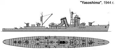 «Ясосима» участвовала в сражении за Филиппины, сопровождая конвои эвакуируемых войск. 25 ноября 1944 года эскортный крейсер был потоплен американскими самолётами с авианосца «Тикондерога» вместе с тяжёлым крейсером «Кумано» в гавани Санта-Крус острова Лусон.[1] В 1947 году корпус бывшего «Пин-Хая» был поднят и возвращен в Китай, где использовался как плавучий причал.