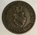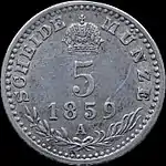 5 крейцеров | 16 | 1,3333 | н/д | рубчатый | серебро 375-й пробы | 1858—1860, 1863, 1864 | Суммарно[Тиражи 4] — не менее 8 223 939[23] |