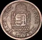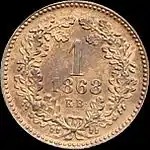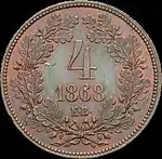 1 крейцер | 19 | 3,33 | 1,5 | гладкий | Медь | 1868, 1869, 1872, 1873 | Суммарно[Тиражи 8] — не менее 21 млн[20] |