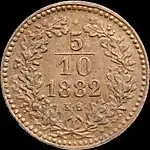 5 крейцеров[коммент. 7] | 16 | 1,3333 | н/д | рубчатый | серебро 375-й пробы | 1865А | 69 375[23] |