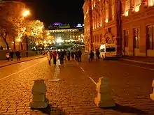 ![]() Кремлёвский проезд вечером. Вид от Манежной площади. Слева здание Исторического музея | |