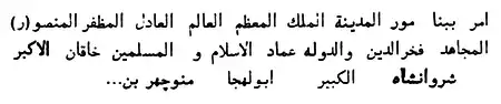 | Приказал построить (эту) городскую стену мелик возвеличенный, премудрый, справедливый, победоносный, побеждающий, муджахид (воитель за веру), гордость религии и державы, опора ислама и мусульма, хакан величайший, ширваншах великий Абу-л-Хайджа Минучихр, ибн…[5]. |