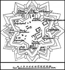 Крепость названа в честь святой Елисаветы — покровительницы императрицы Елизаветы Петровны. Имел форму правильного шестиугольника периметром (вместе с внешними укреплениями) до 6 верст (6,3 км).