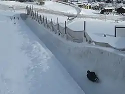 На трассе расположено 10 виражей, самый известный (скорее печальный) из которых называется «Волан» («Shuttlecock»). Поскольку профиль дорожки здесь более широкий в виде буквы «U» с открытым верхом (без козырька), сани могут вылететь за пределы трассы.[8] Вышеупомянутая кривая служит предохранительным клапаном для слишком быстрых спортсменов не контролирующих свой спуск, так чтобы они не достигли нижней, более опасной части трассы. Зона вылета уложена тюками соломы. Спортсмены, которые не проходят эту зону автоматически принимаются в «Клуб волан».