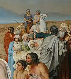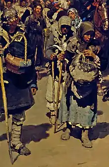 В левой части картины находится бедная часть толпы — «странники и странницы, в лаптях и онучах, с палками и жезлами, с лямками и котомками, в сермягах и отрепьях»[84]. На левом срезе полотна изображён паломник, повернувший голову в сторону торжественного шествия. В его фигуре подчёркнуты спокойствие и чувство собственного достоинства. Правее него находятся две паломницы. Изображая их забитость и убогость, художник тем не менее «относится к ним с большой теплотой», избегая «гротескной резкости» в трактовке их образов[90].