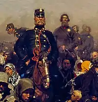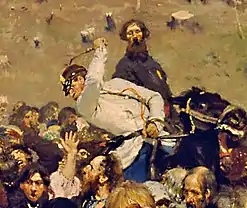 Среди множества полотен, экспонировавшихся на 11-й передвижной выставке, художественный критик Владимир Стасов особое внимание уделил произведениям Ильи Репина «Крестный ход в Курской губернии»[122] и «Поприщин»[123]. По мнению Стасова, картина «Крестный ход», громадная в ширину и «с целым народонаселением на сцене», — «достойный товарищ» появившимся ранее репинским «Бурлакам на Волге»: «та же правда, та же глубокая национальность и тот же поразительный талант», а также «шествие целой толпы народной, разношёрстной, разнохарактерной, разнотипичной»[84]. Давая подробное описание действующих лиц полотна «Крестный ход», Стасов писал, что «всё это вместе, двигающееся прямо на зрителя издали огромной разрастающейся процессией, — это одно из лучших торжеств современного искусства»[12].