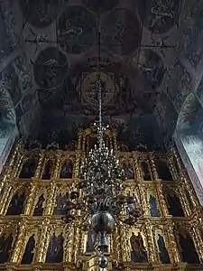 Общими чертами палехской иконописи являются смешение традиций писания, «пройменные иконы», схожие лики святых и цветные пробела, профессиональное владение рисунком, многофигурность композиций и стилистическая умеренность, песенный стиль и копирование западных мастеров, многоклеймовые иконы[6]. Иконостас выполнен в начале XX века в самарской мастерской братьев И. В. и В. В. Белоусовых. Стилизован под барочный иконостас XVIII века. Иконы в нём также поздние при наличии нескольких подлинников соответствующей эпохи.