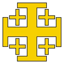 Крест крестоносцев представляет собой пять золотых крестов на серебряном фоне. Считается, что крест был взят в качестве герба норманнским завоевателем Годфридом Бульонским. После освобождения Иерусалима от власти мусульман (1099, Первый крестовый поход) Годфрид Бульонский, став правителем Иерусалима, по его словам, «не мог принять золотой венец там, где Христос принял венец терновый», отказался от королевского достоинства и принял титул «Хранитель и Защитник Гроба Господня». Однако в реальности изображённый крест — это «Крест Иерусалима» («Иерусалимский Крест»). «Крест крестоносцев» — это чаще всего красный (алый) равносторонний или же с более длинной вертикальной частью и более короткой поперечной) прямой крест на белом или любом ином фоне, который был отличительным знаком участника Крестовых походов.