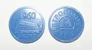 Юбилейный жетон с изображением вестибюля станции метро «Крещатик», изготовленный ко дню 50-летия метрополитена