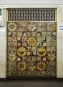 В оформлении станции авторы обратились к источникам украинского искусства. Пилоны облицованы полированным желтовато-розовым мрамором, со сторон центрального зала и платформ на них расположены майоликовые вставки со сложными растительными орнаментами. «Сельскохозяйственная революция» Никиты Хрущёва здесь тоже отмечена — на металлических латунных карнизах выгравированы изображения подсолнухов и кукурузы. За карнизами смонтирована подсветка.