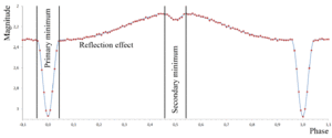 Область, обозначенная на рисунке Primary minimum, соответствует главному минимуму блеска: яркий белый карлик находится в затмении, наблюдатель видит лишь тусклый холодный спутник, поэтому суммарный блеск системы минимален. Повышение блеска по краям области соответствует частичному затмению белого карлика. По мере того, как при орбитальном обращении белый карлик выходит из-за спутника, наблюдатель видит всё увеличивающуюся долю его диска, и блеск системы возрастает. Фаза 0,5 соответствует положению, когда белый карлик и спутник меняются местами: белый карлик располагается перед спутником и проходит по его диску в процессе орбитального движения. При этом затмевается некоторая часть диска спутника, и на кривой блеска появляется вторичный минимум (обозначен на рисунке как Secondary minimum). Поскольку затмеваемая область спутника невелика и имеет низкую (по сравнению с белым карликом) температуру, то её блеск невелик; в результате вторичный минимум не так глубок, как главный минимум.