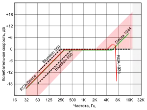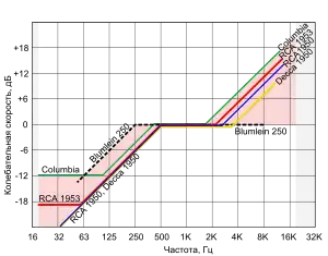Вплоть до конца Второй мировой войны европейцы ориентировались на механическое воспроизведение пластинок патефонами и потому тяготели к режиму постоянства амплитуд скорости; режим постоянства амплитуд смещения применялся лишь вынужденно, на самых низких частотах[63]. В более богатых США, где покупатели могли позволить себе электрофоны и радиолы, режим постоянства амплитуд смещения применялся на значительно более широкой полосе, вплоть до 1 кГц[63][64]. В середине 1930-х годов американские студии заменили старые, «звонкие» конденсаторные микрофоны на новейшие, относительно нейтральные ленточные микрофоны. Так как тембр таких записей казался тусклым, обеднённым по сравнению со старыми пластинками, то для «компенсации потерь» студии стали поднимать уровень высоких частот фильтрами, встроенными в микрофонные предусилители[7]. Другие технические проблемы при записи высоких частот — спад АЧХ записи из-за несовершенства резцов 1930-х годов[комм. 12] и рост нелинейных искажений по мере уменьшения радиуса канавки при воспроизведении — также корректировались подъёмом высоких частот[8].