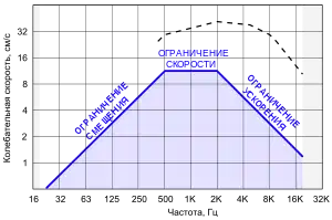 - Постоянная амплитуда смещения до частоты 500 Гц, постоянная амплитуда скорости выше этой частоты.