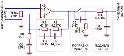 Существуют четыре базовые, равнозначные конфигурации петли частотнозависимой обратной связи (R1C1R2C2), охватывающей ОУ. В приведённом варианте («цепь А» по Липшицу) R1C1=T1=3180 мкс, R2C2=T2=75 мкс, (R1||R2)(C1+C2)≈T3=318 мкс[98]. Ёмкость C0 совместно с R0 образует не предусмотренный стандартом ФВЧ с частотой среза 3,3 Гц, препятствующий усилению напряжения смещения ОУ; отключаемый ФВЧ «поправки МЭК» R3C3 выполнен пассивным. Так как коэффициент усиления ОУ в неинвертирующем включении никогда не опускается ниже единицы, то для подавления прохождения на выход ультразвуковых частот в схему дополнительно введён пассивный ФНЧ R4C4 с частотой среза 63 кГц[89]. Для компенсации затухания, вносимого этим фильтром в звуковом диапазоне, постоянная времени (R1||R2)(C1+C2) выбрана несколько отличной от стандартных 318 мкс.