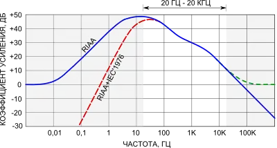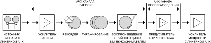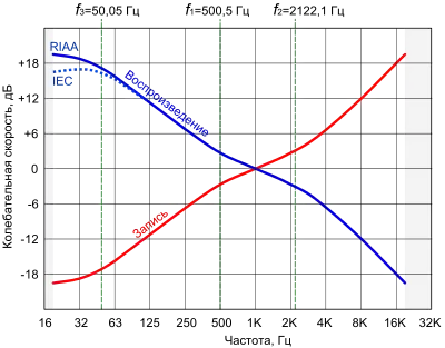 с теми же, что и в АЧХ записи, значениями постоянных времени и частот. Отклонение АЧХ реальных устройств от стандарта не нормируется исходя из предположения, что такое отклонение может быть скорректировано темброблоком усилителя[9]. Целевое значение предельного отклонения АЧХ от стандарта, принимаемое при разработке высококачественных предусилителей-корректоров, составляет ±0,1 дБ[11].