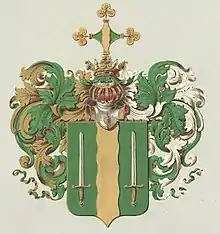 В зелёном щите волнообразный золотой столб, сопровождаемый двумя серебряными мечами с золотыми рукоятками, остриями вверх.