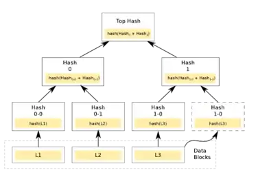 Дерево Меркла — полное двоичное дерево, в листовые вершины которого помещены хеши от транзакций, а внутренние вершины содержат хеши от сложения значений в дочерних вершинах, а корневой узел дерева (Top Hash) содержит хеш от всего набора данных.