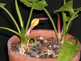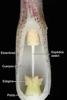 В нижней части початка расположены шесть женских цветков, образующих внешний круг из шести сросшихся гинецеев, внутренний круг женских цветков преобразован в стерильные подушечки — осмофоры. Выше по початку, после стерильной зоны расположены многочисленные мужские цветки (их может быть более 100), каждый из них состоит из двух тычинок. Оканчивается початок коротким придатком. Завязь одногнёздная, с несколькими семя-зачатками.