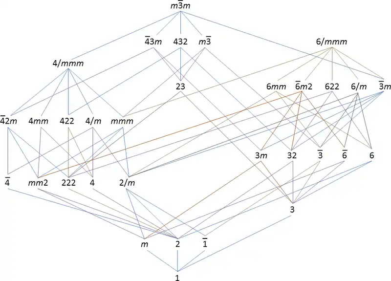 На данной схеме группы расположены от менее симметричных (снизу) до групп с более высокой симметрией (сверху). Группы одинакового порядка лежат на одной высоте. Каждая нижележащая группа является подгруппой старшей группы, связанной с ней линией. Для удобства восприятия линии даны разного цвета.