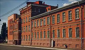 Центральный заводской корпус построен в начале XX века из неоштукатуренного кирпича в «кирпичном стиле» с элементами стиля модерн. Двухэтажный главный фасад несимметричен, угловая часть оформлена в виде башни, ризалит в середине фасада — в виде другой башни. В декоре наиболее характерен широкий арочный пояс. Средний оконный проём левой части второго этажа стрельчатый, с лучковым сандриком, над которым разорван карниз. Фасад между «башнями» — с прямоугольными оконными проёмами, украшенными сандриками, замковыми камнями и плоскими нишами под окнами[1].