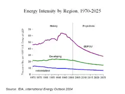 По данным Министерства энергетики США, социалистические экономики также поддерживали гораздо более высокий уровень энергоёмкости, чем западные страны или страны третьего мира. Этот анализ подтверждается Институтом экономических вопросов, при этом Михаил Бернштам заявляет, что в странах Восточного блока энергоёмкость в два-три раза выше, чем в странах Запада.[54] Некоторые видят, что вышеупомянутые примеры деградации окружающей среды похожи на то, что имело место в западных капиталистических странах на пике их стремления к индустриализации в 19 веке.[55] Другие утверждают, что коммунистические режимы причинили больший ущерб, чем в среднем, в первую очередь из-за отсутствия какого-либо общественного или политического давления на исследования экологически безопасных технологий.[56]