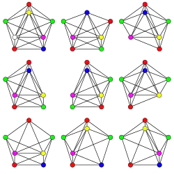 Вверху слева вершинно критический граф с хроматическим числом 6. Остальные N-1 подграфов имеют хроматическое число 5.
