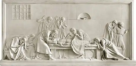 ![]() «Критон закрывает глаза Сократу». Барельеф 1790—1792 годов Антонио Кановы на котором Критон (четвёртый слева) закрывает глаза Сократу. Галерея на площади Скала, Милан, Италия | |
