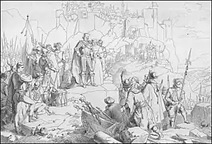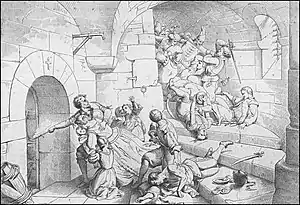 Один коварный злодей вышел на зубчатые стены, махая белым носовым платком в своей проклятой руке. По прибытии в это место была взорвана мина, которую они предварительно подготовили. Кто был над этим местом или около него взлетали в воздух и горели, как жареное мясо. Многие тела наших благородных воинов и мерзких неверующих стали добычей огня[40].