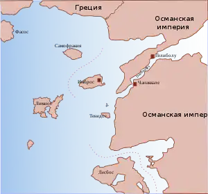 30 марта венецианский флот по приказу Джироламо Морозини бросил якорь у Дарданелл, пытаясь блокировать проход османского флота через пролив[46]. Для пресечения османских поставок на Крит группа из 23 венецианских кораблей под командованием Томмазо Морозини попыталась захватить стратегически важный остров Тенедос у входа в проливы. 26 мая капудан-паша Коджа Муса во главе флота из 80 военных кораблей попробовал пробиться из проливов в Эгейское море, но был отброшен обратно в Дарданеллы[80][46]. Однако уже 4 июня флот венецианцев не смог остановить османов, потому что отсутствие ветра позволило османским галерам уклониться от венецианских парусников. Таким образом, османы смогли без помех доставить новые войска и припасы на Крит[81]. Усилия венецианского флота по борьбе с сухопутными операциями Османской империи на Крите также потерпели неудачу из-за нерешительности командующих, задержек в оплате экипажам и последствий чумы[82].