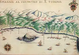Для захвата Канеи было необходимо контролировать остров Айи-Теодори[38]. Этот скалистый островок расположен рядом с Критом на расстоянии около трёх миль от Канеи. На нём на расстоянии одной мили друг от друга стояли две крепости[40]. Первая, называвшаяся Турлулу, была построена на возвышенности со стороны, противоположной Криту, и была предназначена для контроля за морем. Однако её расположение не позволяло ей просматривать побережье Крита, и потому был выстроен второй форт, называвшийся Айя Теодори, Айя Тодори или Сан-Тодеро[41]. Ширина стен этих крепостей составляла пятьдесят ярдов, а высота — двенадцать. Каждая была хорошо оснащена — в них было большое количество пушек, боеприпасов и продовольствия[40].