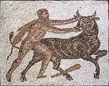 Микенский царь Эврисфей велел Гераклу привести критского быка в Микены. Герой с согласия Миноса изловил животное, сел к нему на спину и переплыл на чудесном быке море с Крита на Пелопоннес, доставив Эврисфею[8]. Совершив этот подвиг, Геракл учредил Олимпийские игры в долине Алфея[9]. Выпущенное на свободу чудесное животное, обуреваемое бешенством, понеслось через весь Пелопоннес, пока не достигло Аттики.
