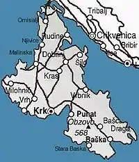 Самые большие населённые пункты — города Крк (5491 жителей), Омишаль (2998), Малинска-Дубашница (2726), Пунат (1876), Добринь (1970), Башка (1554), Врбник (1245). Город Крк расположен в юго-западной части острова.
