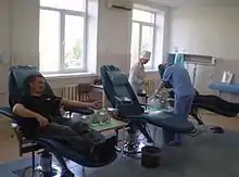 До́норство кро́ви (от лат. donare — «дарить») и (или) её компонентов — добровольная сдача крови и (или) её компонентов донорами, а также мероприятия, направленные на организацию и обеспечение безопасности заготовки крови и её компонентов. После регистрации и заполнения небольшой анкеты донор проходит медицинское обследование: сдаёт анализ крови из пальца и осматривается врачом. Всё это происходит непосредственно на донорском пункте и не занимает много времени. После процедуры сдачи крови рекомендуется воздерживаться от тяжёлых физических и спортивных нагрузок, подъёма тяжестей, в том числе и сумок с покупками, до конца дня, в который была сдана кровь. В течение двух суток после процедуры сдачи крови рекомендуется полноценно и регулярно питаться и выпивать не менее двух литров жидкости в день: соки, воду, некрепкий чай (алкоголь не рекомендуется)[9]. В зависимости от перенесённых ранее заболеваний, операций, процедур (в том числе после аборта, в период беременности и лактации), человек может быть не допущен к сдаче крови временно (временное противопоказание) или постоянно (абсолютное противопоказание). Сдача крови приводит к потере жидкости в организме и снижению давления, в связи с чем вводятся ограничения[10].