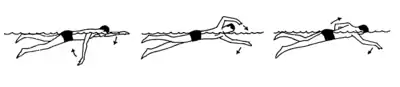 Приблизительно одновременно с началом взмаха одной руки вперёд другая начинает фазу гребка. Во время взмаха локоть движется вперёд в направлении плавания, а кисть расслаблена и свободно свисает, почти касаясь поверхности воды (эта техника плаванья, т. н. «скользящая», неправильна, так как локоть следует поднимать выше и напрягать кисть, после чего тянуть её вперёд). Движение напоминает вынимание руки из заднего кармана брюк, при этом мизинец оказывается выше других пальцев. Последующее движение по расположению пальцев похоже на расстегивание молнии. Рука выносится вперёд тела, пальцы расслаблены, близко от поверхности воды. В этой фазе одно плечо поднимается над уровнем воды и таким образом уменьшает сопротивление тела встречной воде. При этом одни пловцы лишь поворачиваются в пояснице, другие предпочитают полностью поворачивать тело на бок.