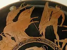 Тесей сражается с Кроммионской свиньёй. Стоит с посохом Файя, хозяйка свиньи. Краснофигурная керамика, Греция, 440—430 г. до н. э.