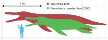 Однако, в 2003 году для образца MCZ 1285 было предложено заметно меньшее значение длины в 9—10 метров[11]. Основываясь на размерах шейных позвонков, в 2012 году ученые оценили длину черепа MCZ 1285 в приблизительно 2190 мм. Однако, этот подход использовал «среднюю» ширину шейных позвонков из тех, что сохранились, и может быть неточным в зависимости от пропорционального изменения размера позвонков в шейном отделе позвоночника. Используя регрессионную линию (Knutsen et al. 2012 год), эта реконструкция предполагала длину черепа в 2850 мм[9][2].