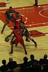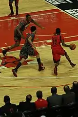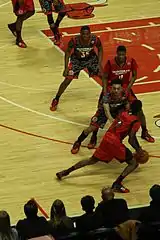 Перевод мяча перед собой вместе с молниеносной сменой направления. Выдающийся исполнитель — Майкл Джордан.