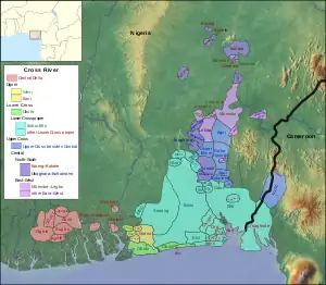 - нижнекросская ветвь (23 языка): эбугху, эфай, ананг, эфик, ибибио, уква, экит, этеби, энван, уда, ибино, ибуоро, ито, иту мбон узо, нкари, ико, илуэ, окобо, оро, усагхаде, эки, идере, оболо;
