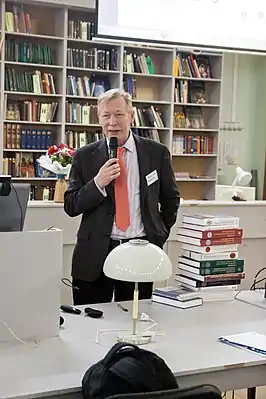 ![]() Николай Кротов представляет свои книги, 2015 год | |