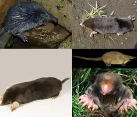 ![]() 1-й столбец: пиренейская выхухоль, европейский крот; 2-й столбец: малая японская могера, выхухоль, восточноамериканский крот. | ||||||||||||